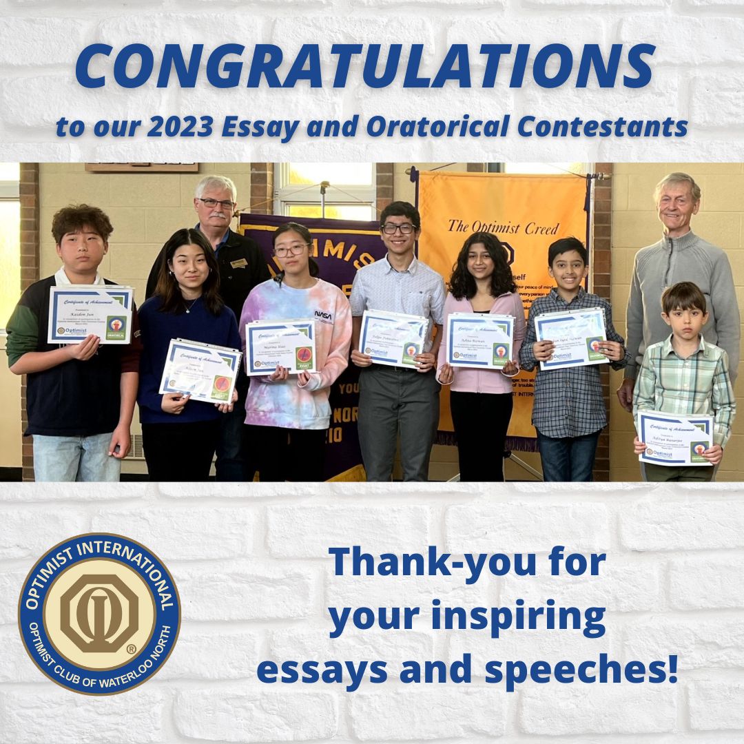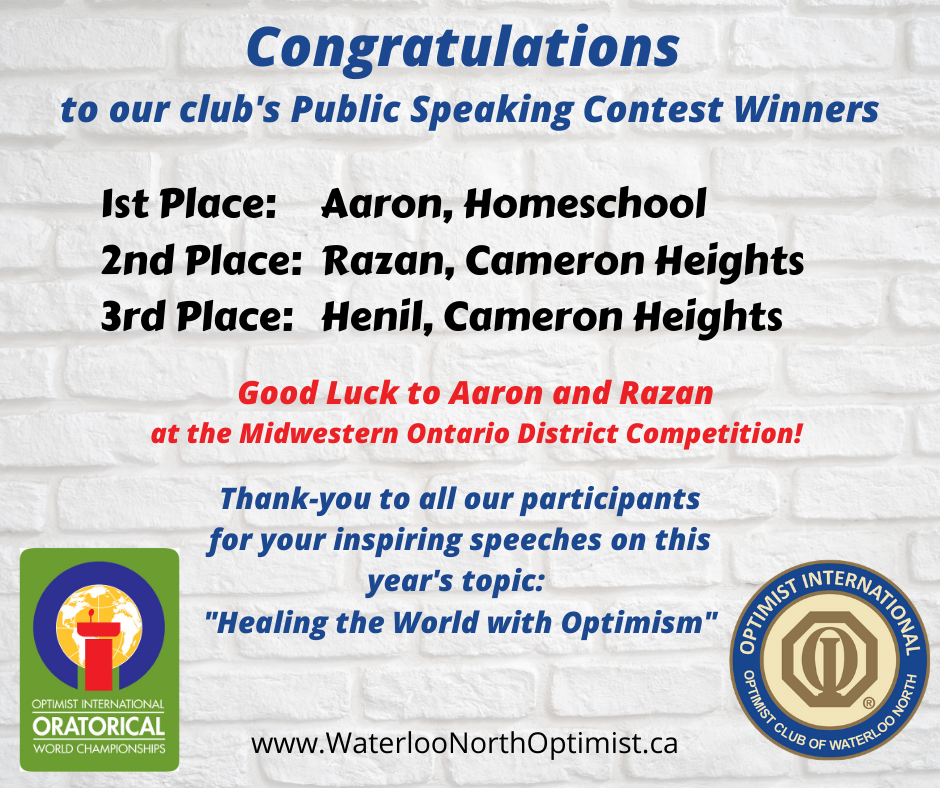 On Saturday, March 23, contestants and their families joined us to compete in our annual public speaking contest. We heard inspiring speeches from our Oratorical Contestants on this year’s topic “How to Change the World with Optimism.” Contest finalist were Nicole, Jasmine and Adina, with Nicole moving on to the Midwestern Ontario District contest. Following the Oratorical Contest speeches, our Essay Contest winner read her Essay on the 2024 topic, “Optimism: How It Connects Us.” Essay contest…
